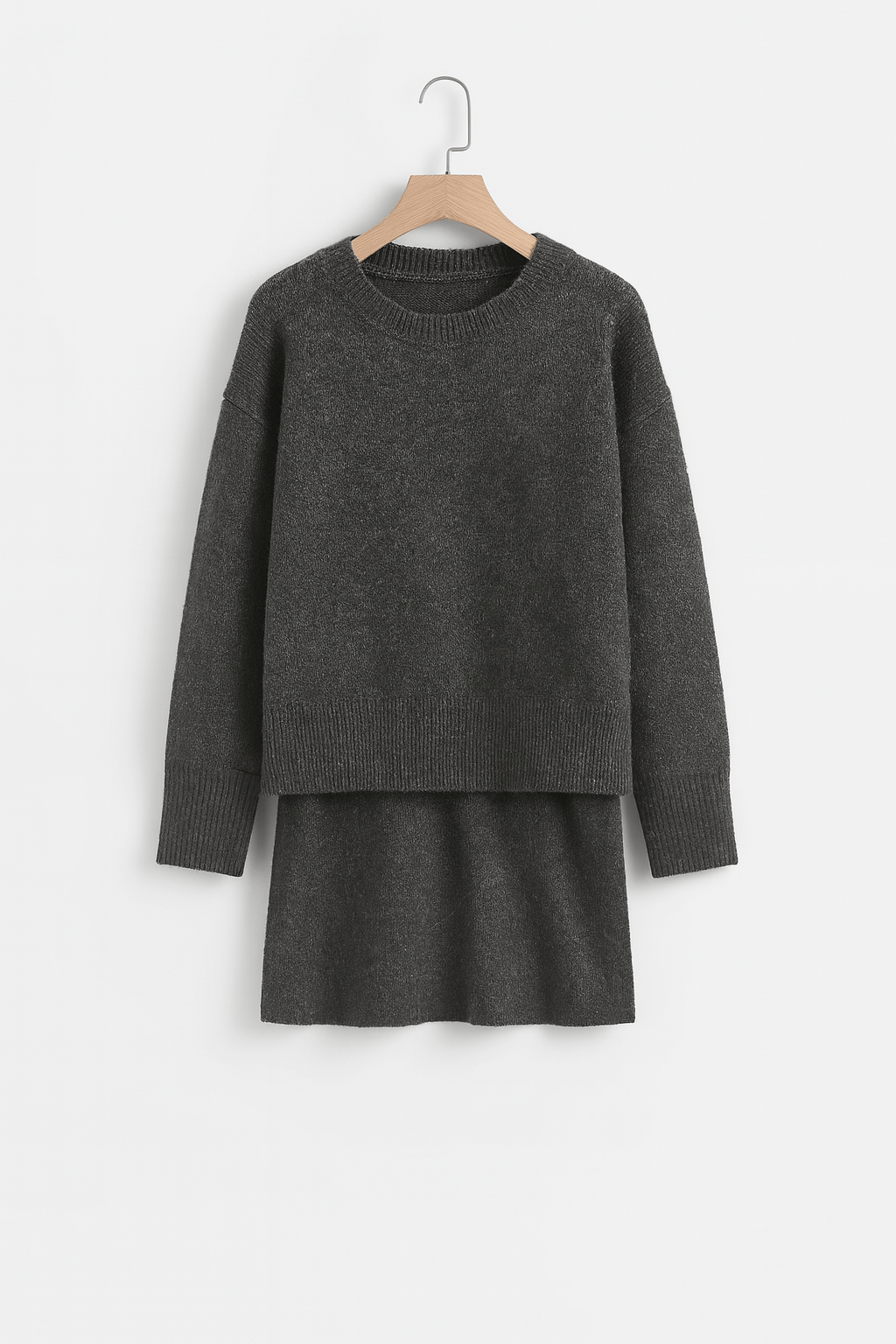 L'ensemble tricot Carina avec pull et mini-jupe allie élégance intemporelle et chic confortable.