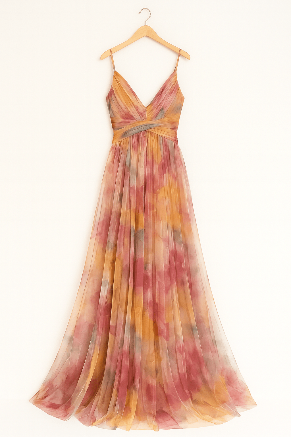 Le tulle fluide avec motif aquarelle, l'effet drapé délicat du haut et les fines bretelles spaghetti donnent à la robe une silhouette de rêve.