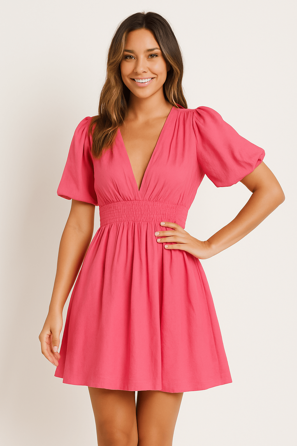 La robe mini Yasmin à manches bouffantes et décolleté en V profond est votre compagne vivante pour les journées chaudes.